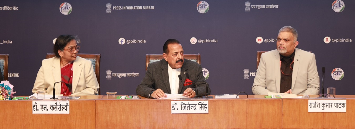 Union Minister Dr. Jitendra Singh speaking during signing of an agreement between the Technology Development Board (TDB) and Visakhapatnam-based Ramuka Global Eco Work Private Limited for commercial production of ECOFIX, a ready-to-use pothole repair mix, at National Media Centre(NMC), New Delhi on Tuesday.